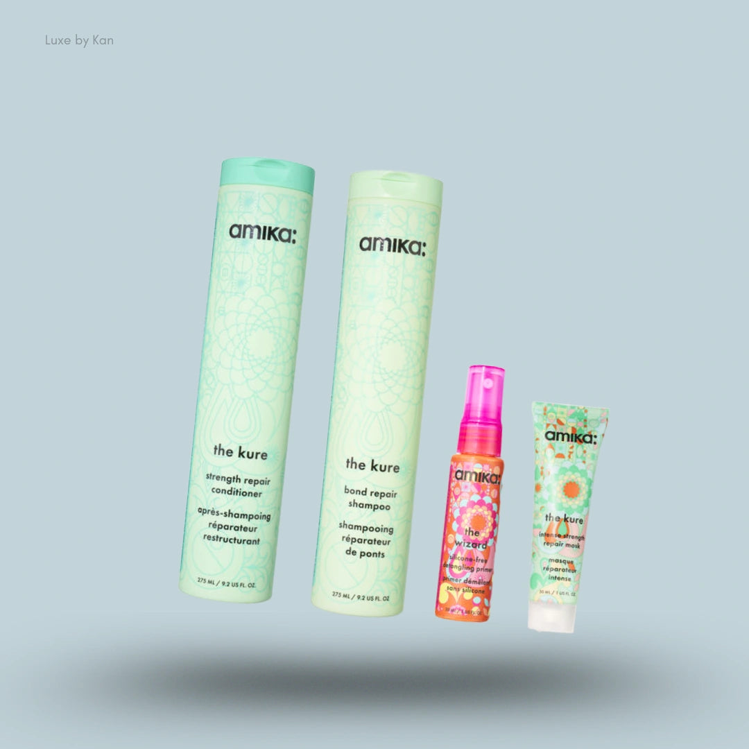 WHAT IT IS: Prevent your hair from reaching its breaking point with this reparative set. Featuring full sizes of The Kure Shampoo and Conditioner, plus travel sizes of The Kure Mask and The Wizard Detangling Primer, this collection is designed to strengthen, hydrate, protect, and detangle damaged hair strands.