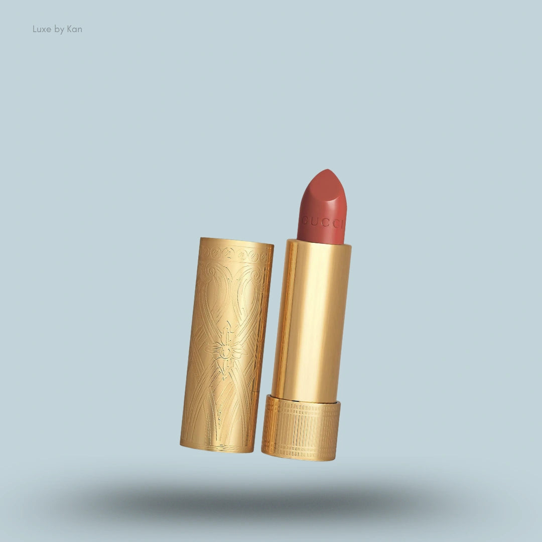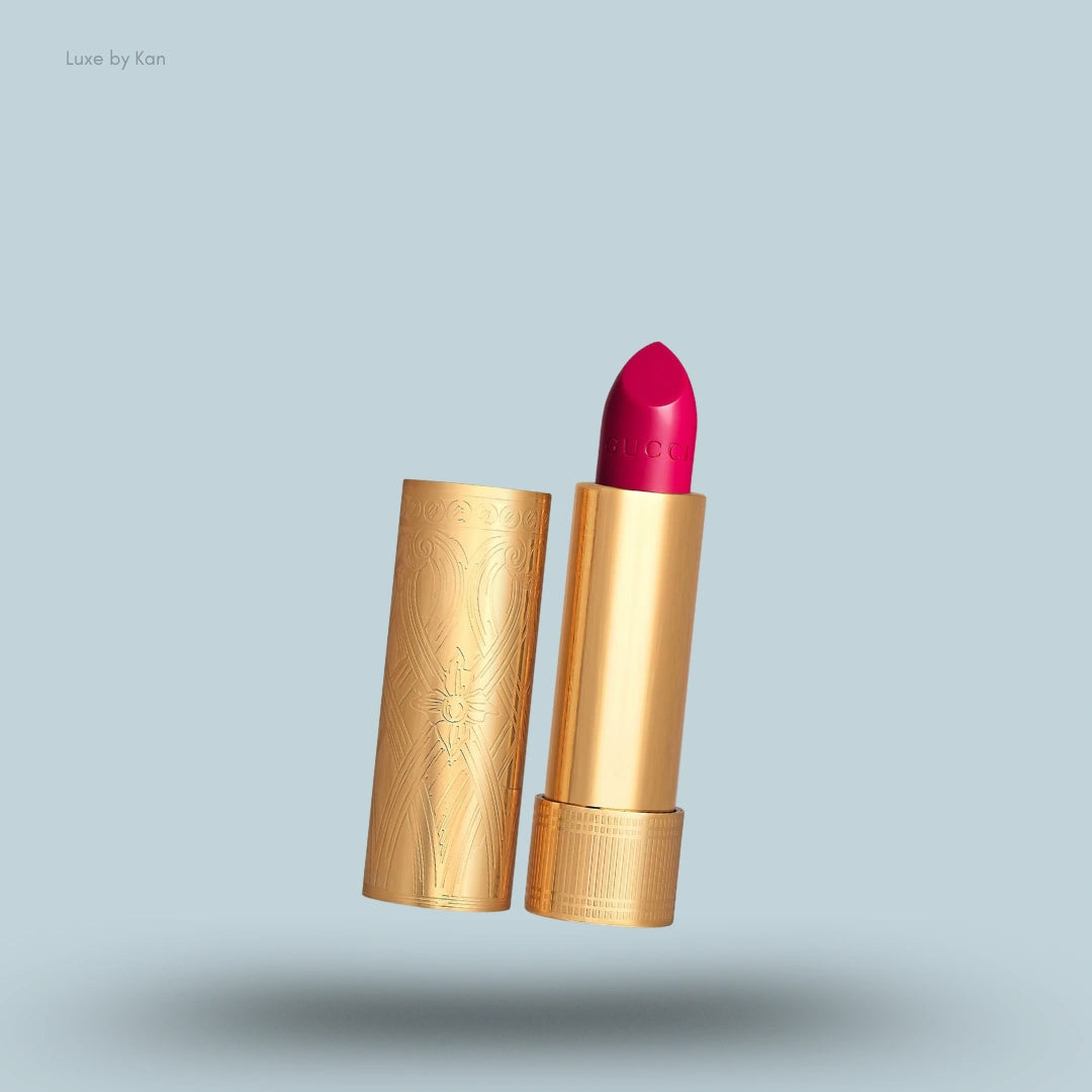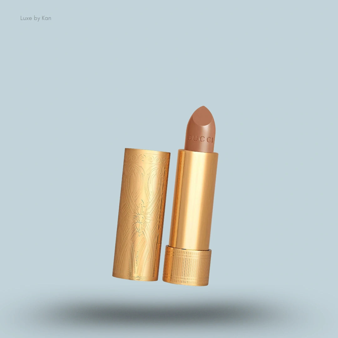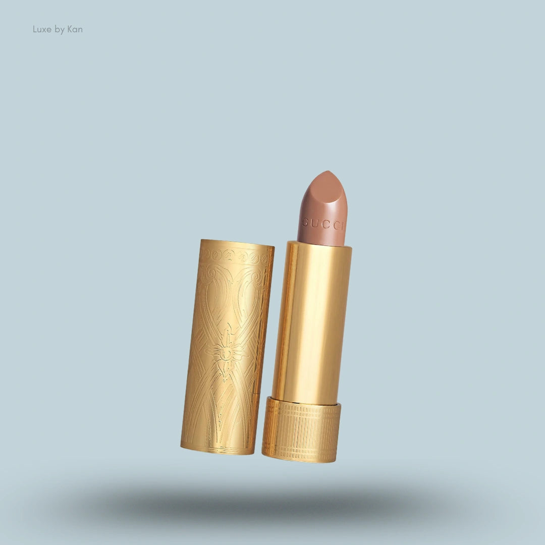 أحمر الشفاه Gucci Rouge à Lèvres Satin هو تركيبة مرطبة تحتوي على مزيج من الشمع والراتنج لتثبيت الشفاه. يتميز برائحة الزهور ويأتي في أنبوب ذهبي اللون محفور عليه تصميم زخرفي متأثر بفن الآرت ديكو.