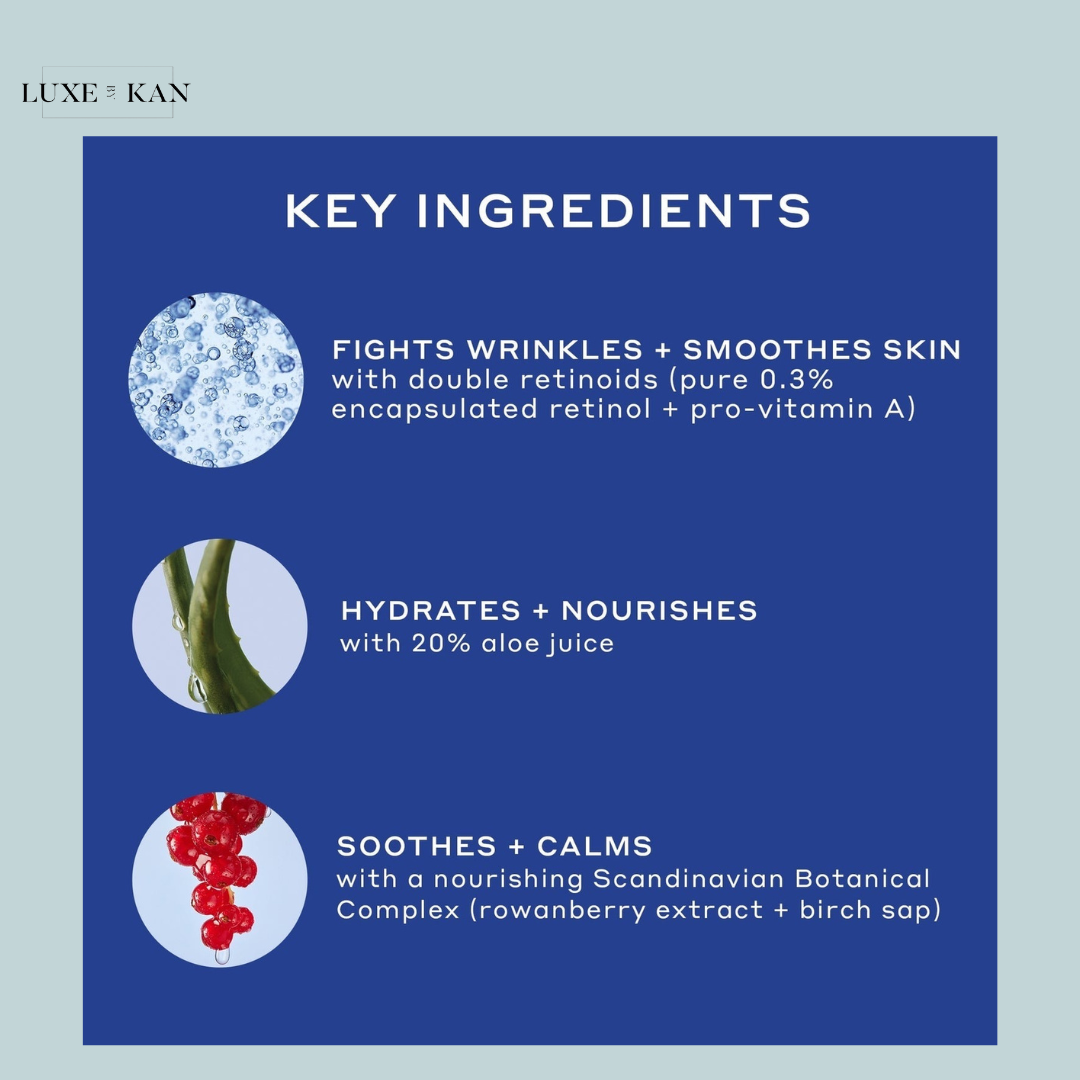 Formulated with encapsulated retinol for gentle, sustained release and provitamin A from beta-carotene, this serum gradually works overnight to deliver long-lasting benefits. In addition to its potent retinoid blend, it features hydrating aloe vera, antioxidant-rich birch sap, and moisture-boosting rowanberry extract to nourish and strengthen the skin barrier.