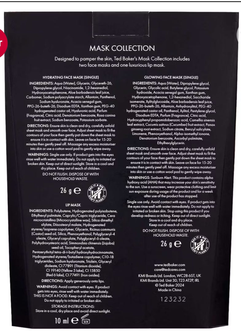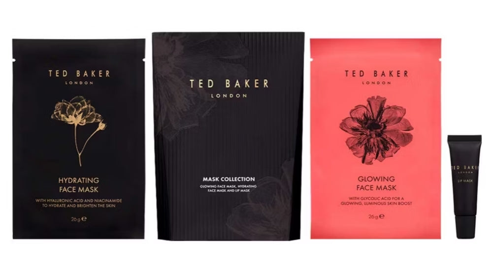 Ted Baker's Mask Collection is designed to nourish, pamper, and hydrate the skin. This set includes two rejuvenating face masks and one luxurious lip mask.