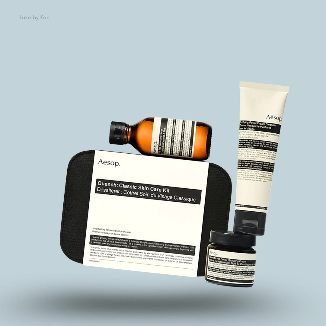 The Aesop Quench: Classic Skin Care Kit is designed to deliver hydration at every step of your daily routine. Specially curated for dry skin, this introductory trio ensures skin feels cleansed, balanced, and deeply nourished.