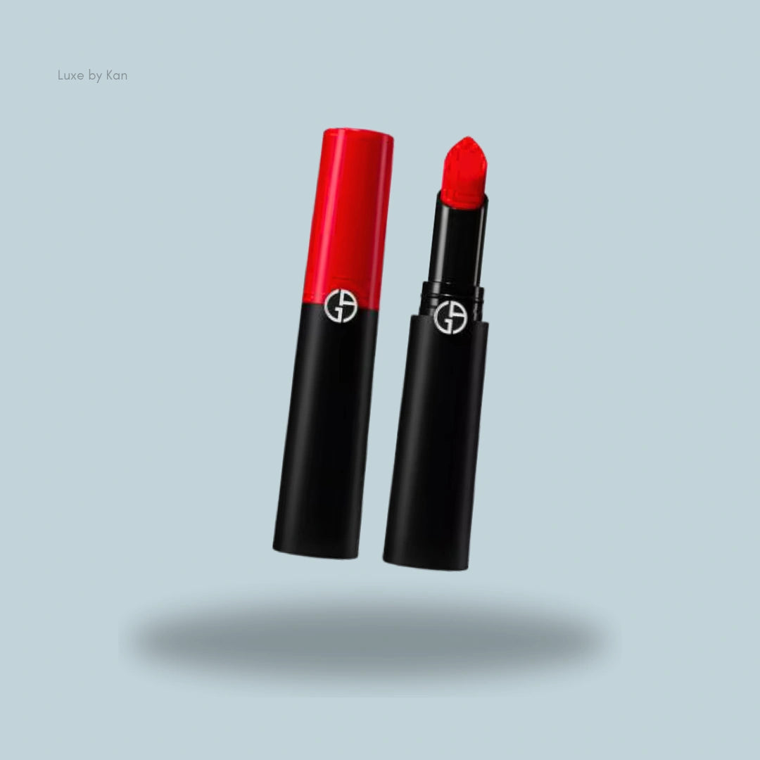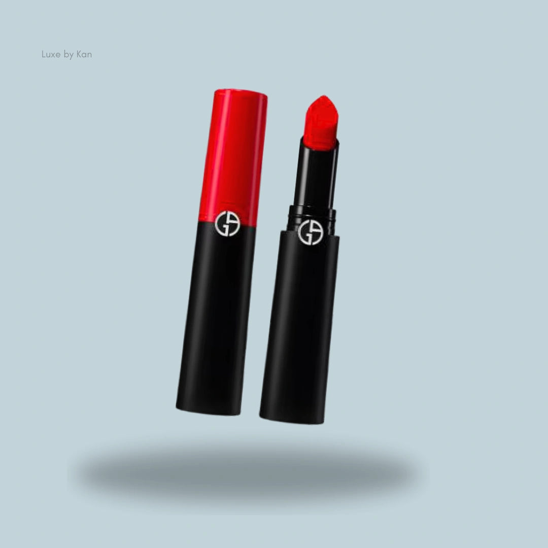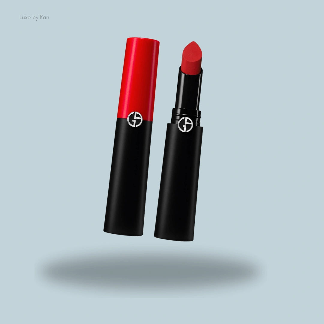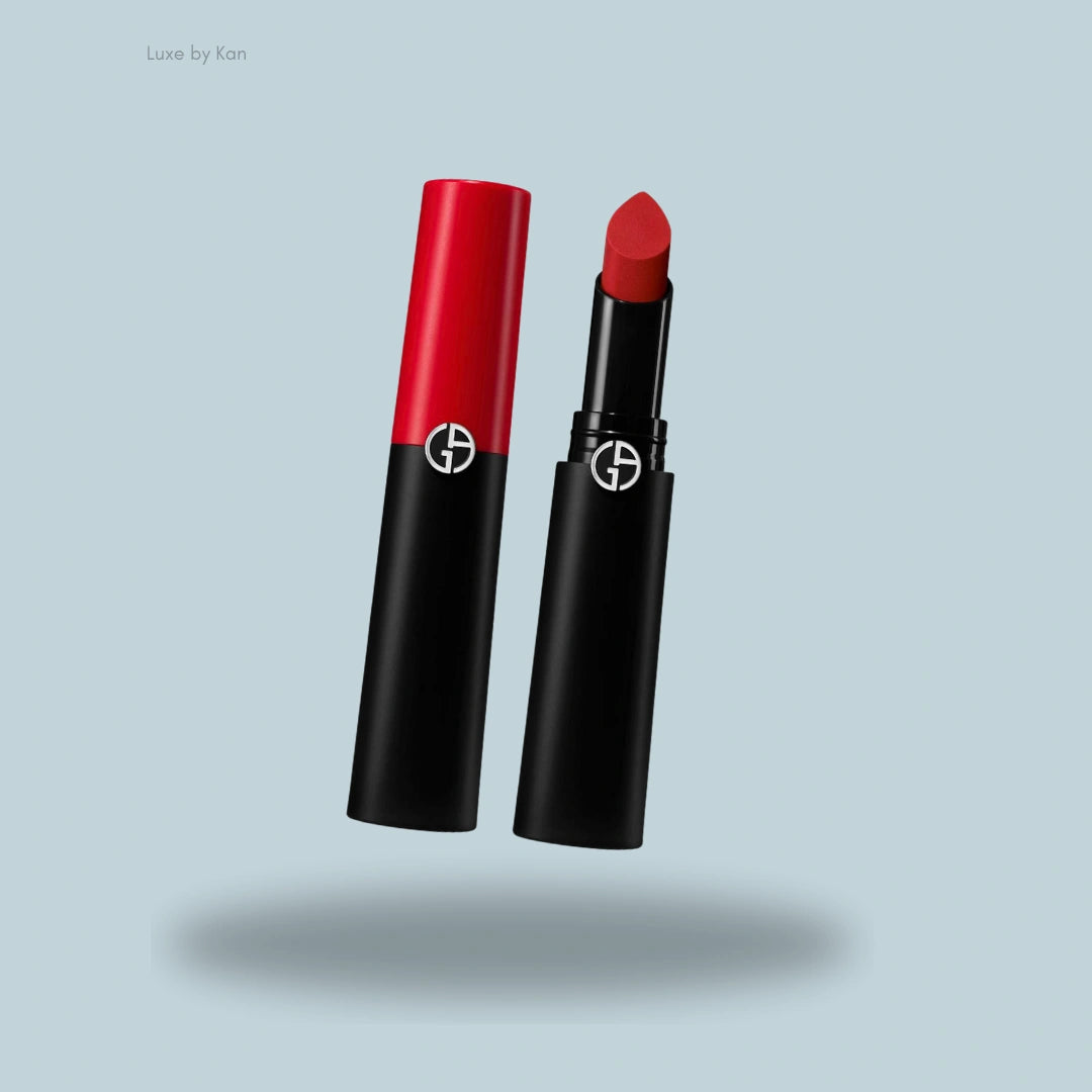 LIP POWER MATTE features a rich palette of up to 17 shades, embodying the signature tones of Giorgio Armani. The lipstick comes in a striking red and black soft matte finish pack with a drop-shaped bullet, allowing for precise, intuitive, and mistake-proof application. The airtight packaging preserves the quality of the formula, ensuring optimal performance.