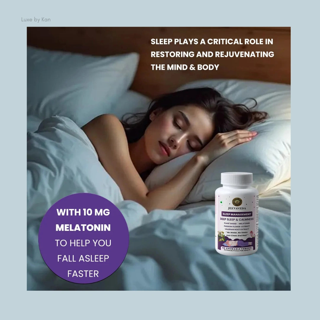 Say goodbye to sleepless nights with Jeevaveda Sleep Management Chewable Tablets – your natural bedtime companion for deep, restful, and stress-free sleep.