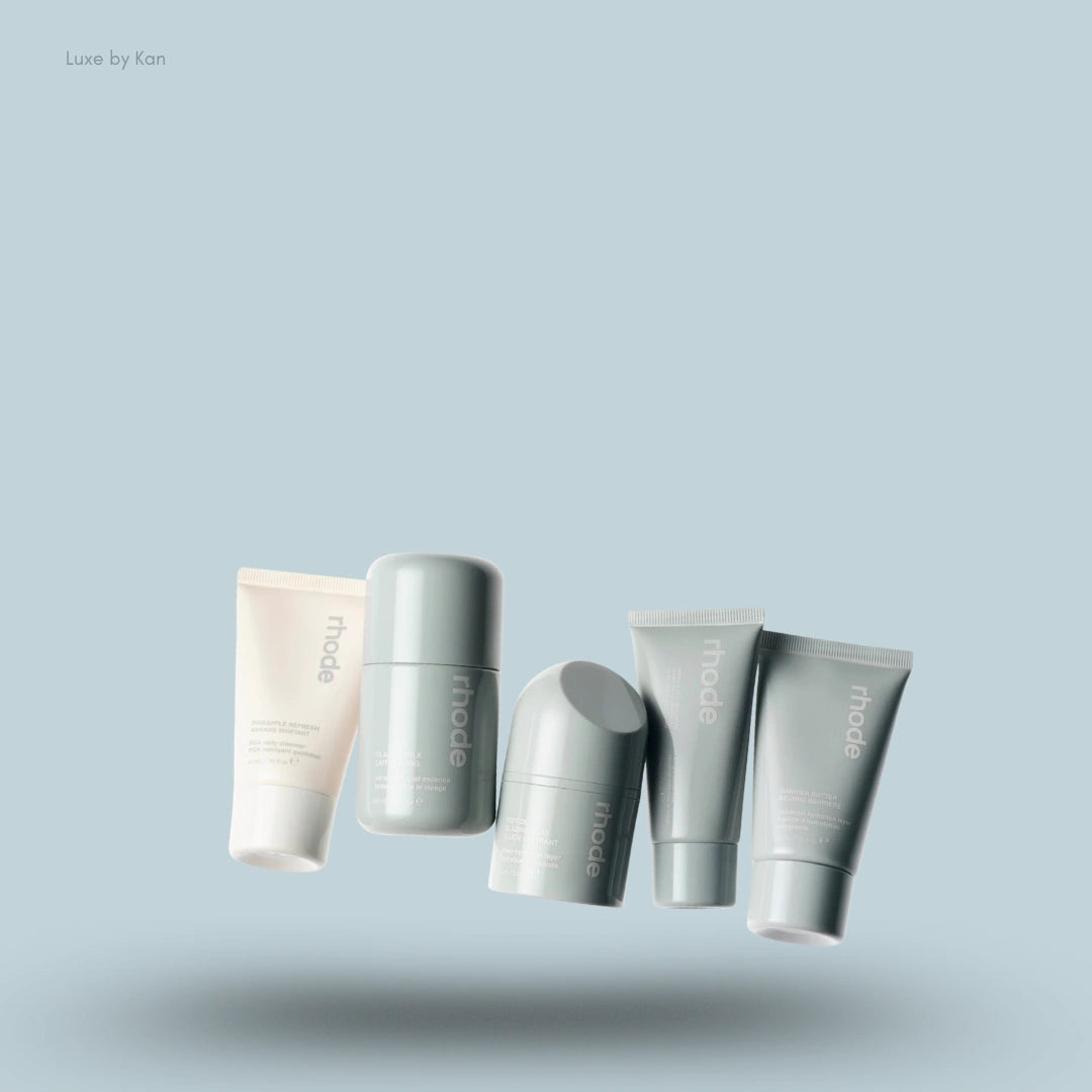 - A Rhode travel skincare set including Little Pineapple Refresh (40 mL), Little Glazing Milk (65 mL), Little Peptide Glazing Fluid (15 mL), Little Barrier Restore Cream (30 mL), and Little Barrier Butter (40 mL).