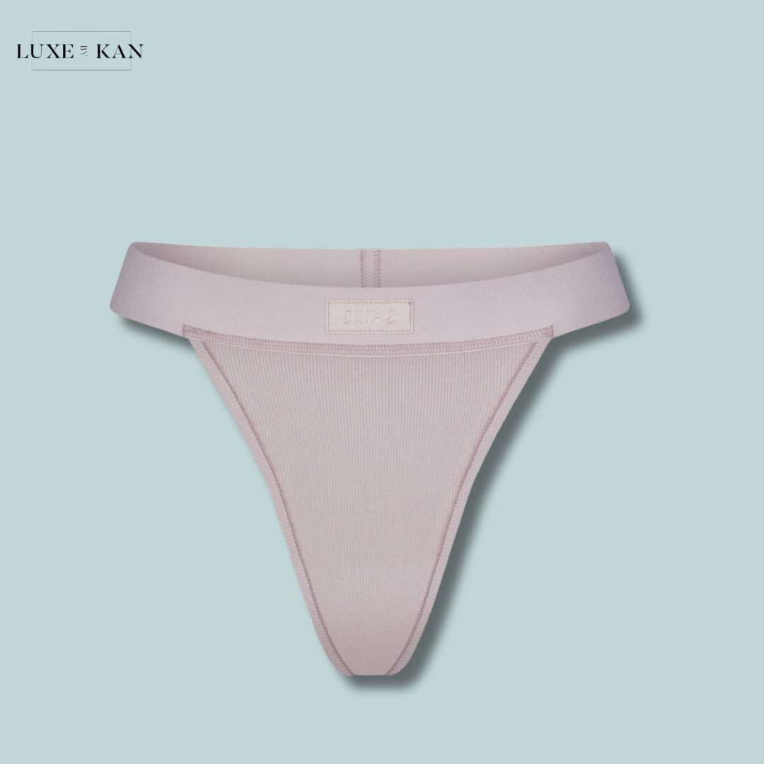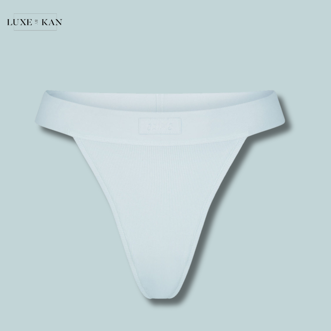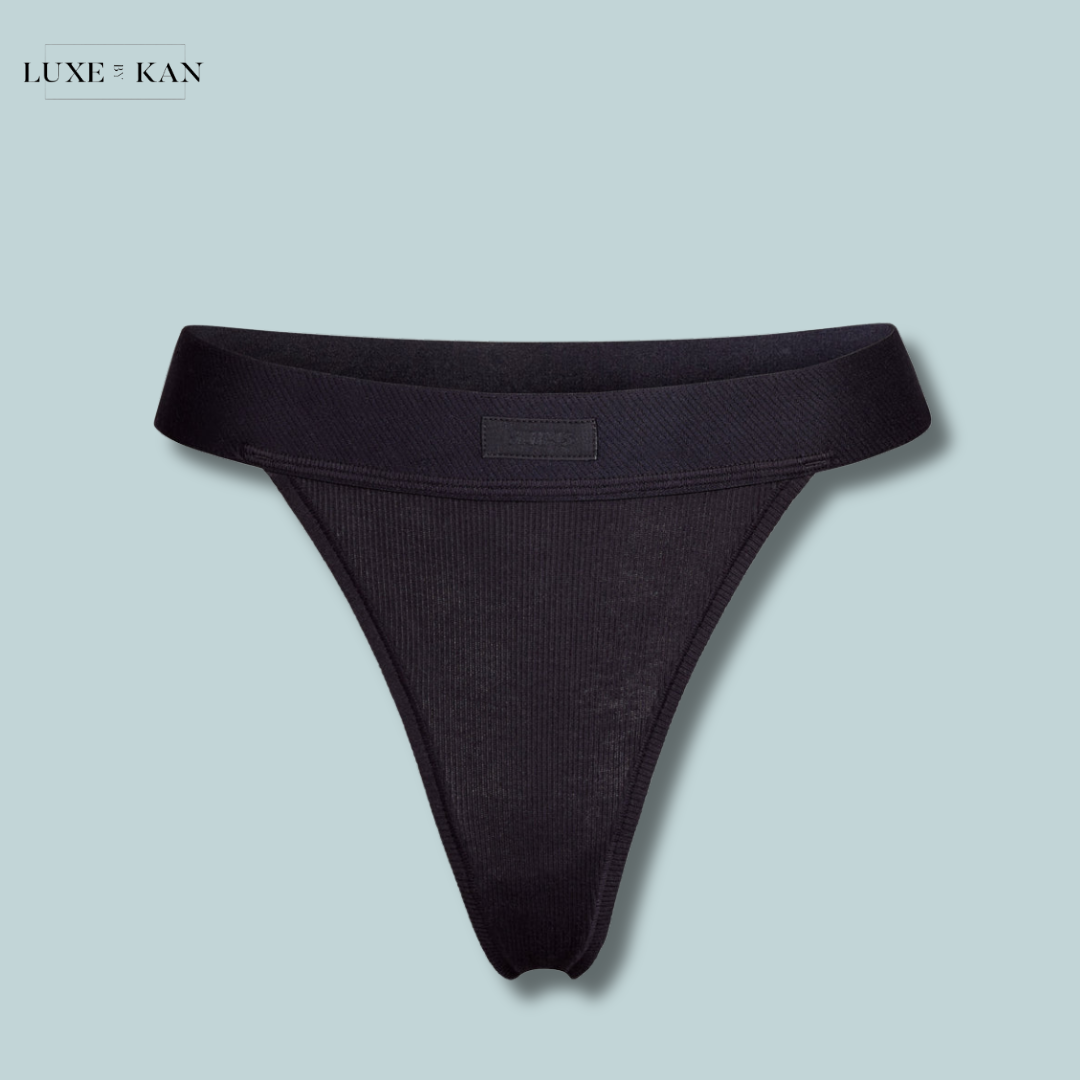 - High rise, wide elasticated waistband, high legs, V-string at back, low coverage at back, all-over ribbed texture